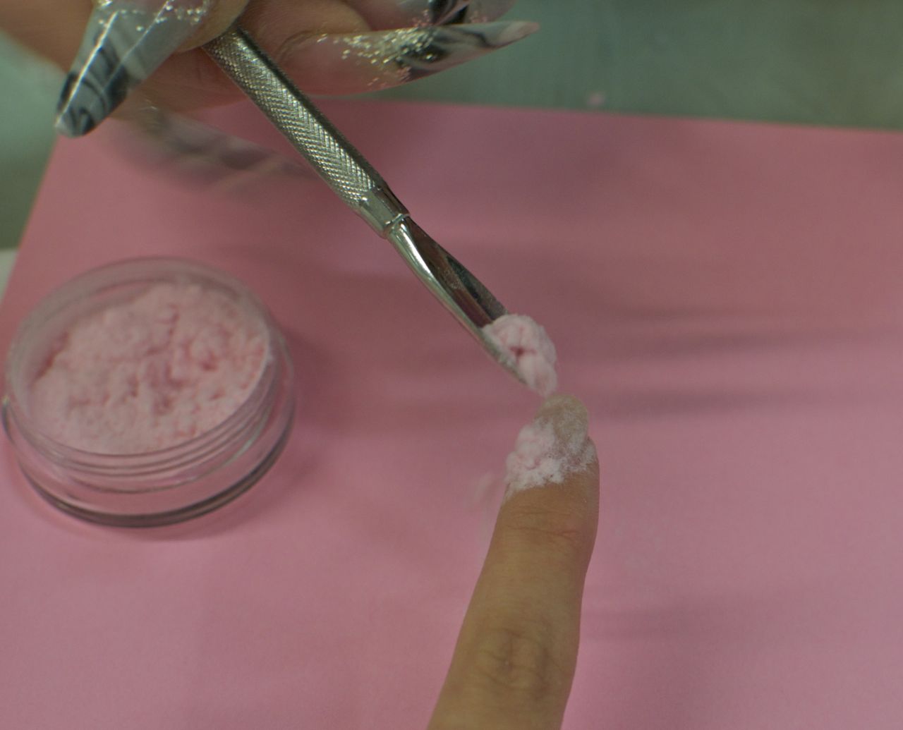 – Ripottele jauhetta kynsille reilusti. Ihan kunnon keko. Anna asettua hetki, käännä kynsi ylösalaisin ja karista. Anna kuivua hetken ja pyyhi kynnen yli pehmeällä siveltimellä. Jos puhallat, tee se riittävän kaukana jauhepurkista.
