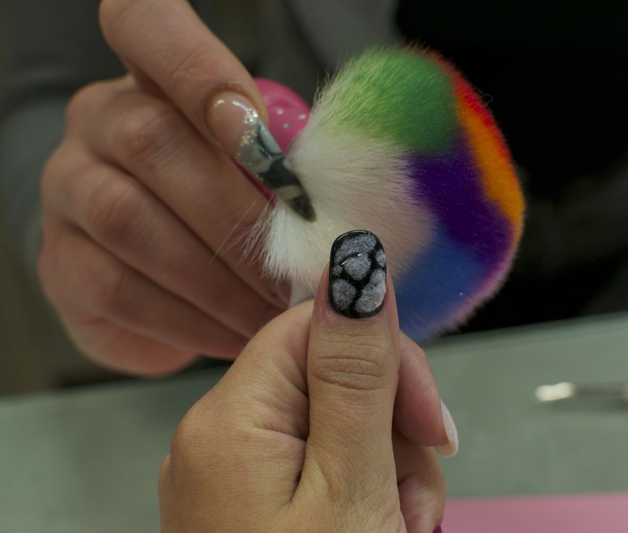 – Etene yksi kynsi kerrallaan. Lopputulos on sitä tasaisempi, mitä märempään lakkaan jauhe ripotellaan.