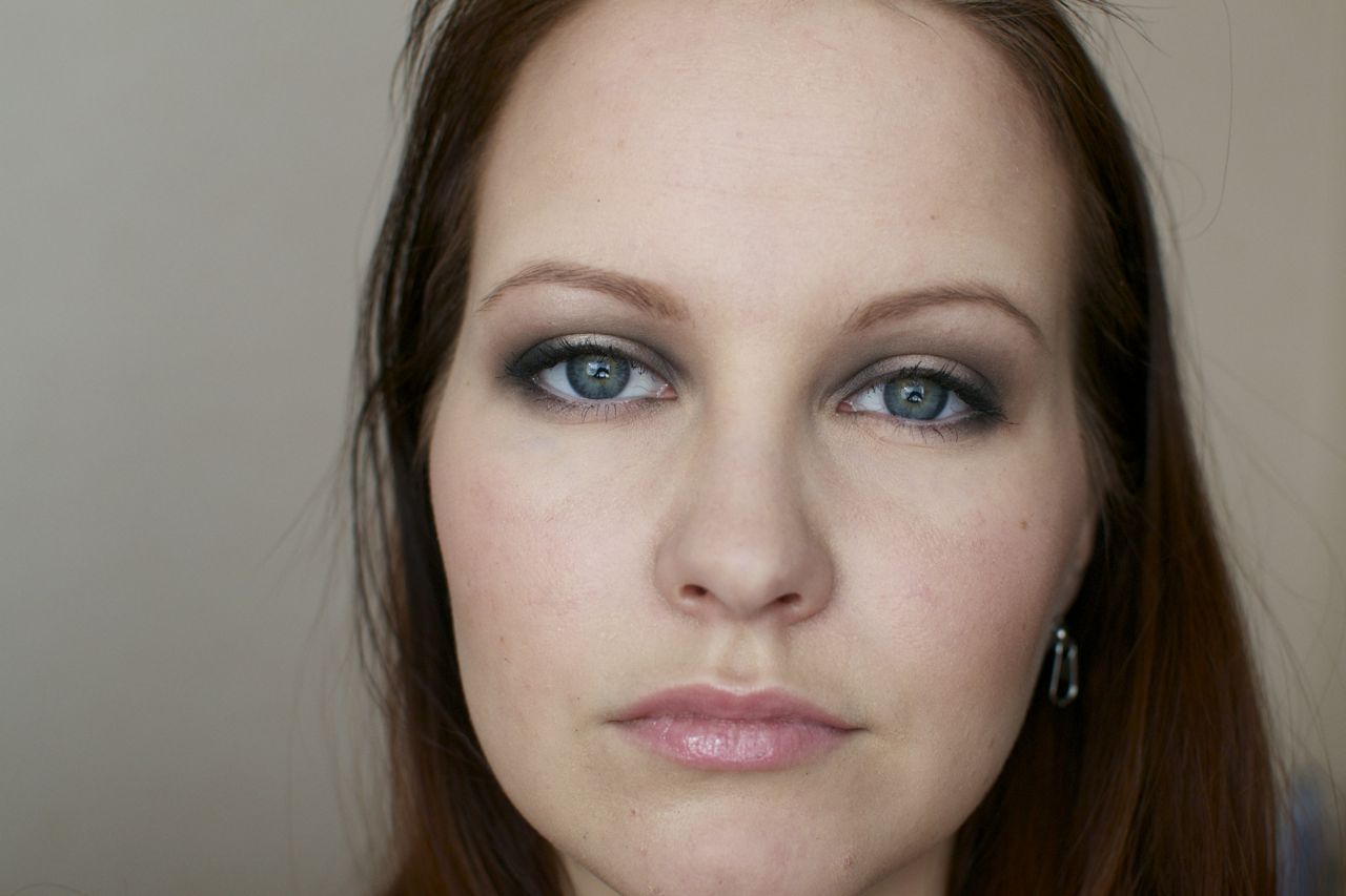 Meinasin ensin nimetä silmät ihan toisin, mutta aloin epäillä termin soveliaisuutta. Kolmiulotteista vaikutelmaa kuitenkin tavoiteltiin ja tässä siitä yksi näkemys. Ilmeen juju on varjostus sekä ulko- että sisänurkassa. Keskelle luomea jätetään vaalea kaistale, joka saa metallisen hohtavan vaalean pinnoitteen.