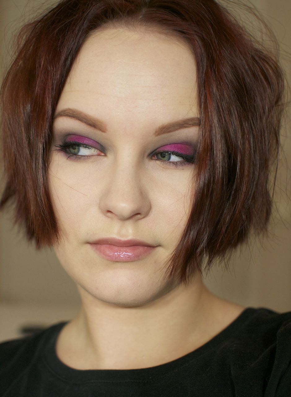 Vauhtisokeassa arkimeikissä ei olisi muuten mitään vikaa, mutta kun se sabotoi koko aamun aikataulun. Kuten tänään. Meinasin laittaa kevyet harmahtavat sumusilmät ja päädyin tähän. Aloitin kevyesti sillä harmaalla, häivyttelin ja olisin voinut jättää siihen. Pieni kaipuu jonkinlaiselle väripiristykselle kolkutteli ja kun tartuin fuksianväriseen pigmenttiin, en vielä tajunnut vaaraa. Kun sitten olin aikani säheltänyt irtopinkillä, oli pakko muuttaa alkuperäistä suunnitelmaa. Ja mitä tummemmaksi mennään, sitä enemmän saa piiperöidä yksityiskohtien kanssa. Ja mitä enempi on piiperöity silmien kanssa, sitä enempi tarvitsee huolitella muuta meikkiä. Kun meikki on huoliteltu, olisi suotavaa, että tukkakin olisi siivossa järjestyksessä. Kun meikki ja tukka on saatu edustuskuntoon, tulee paineita sopivasta vaatetuksesta. Ymmärrätte.